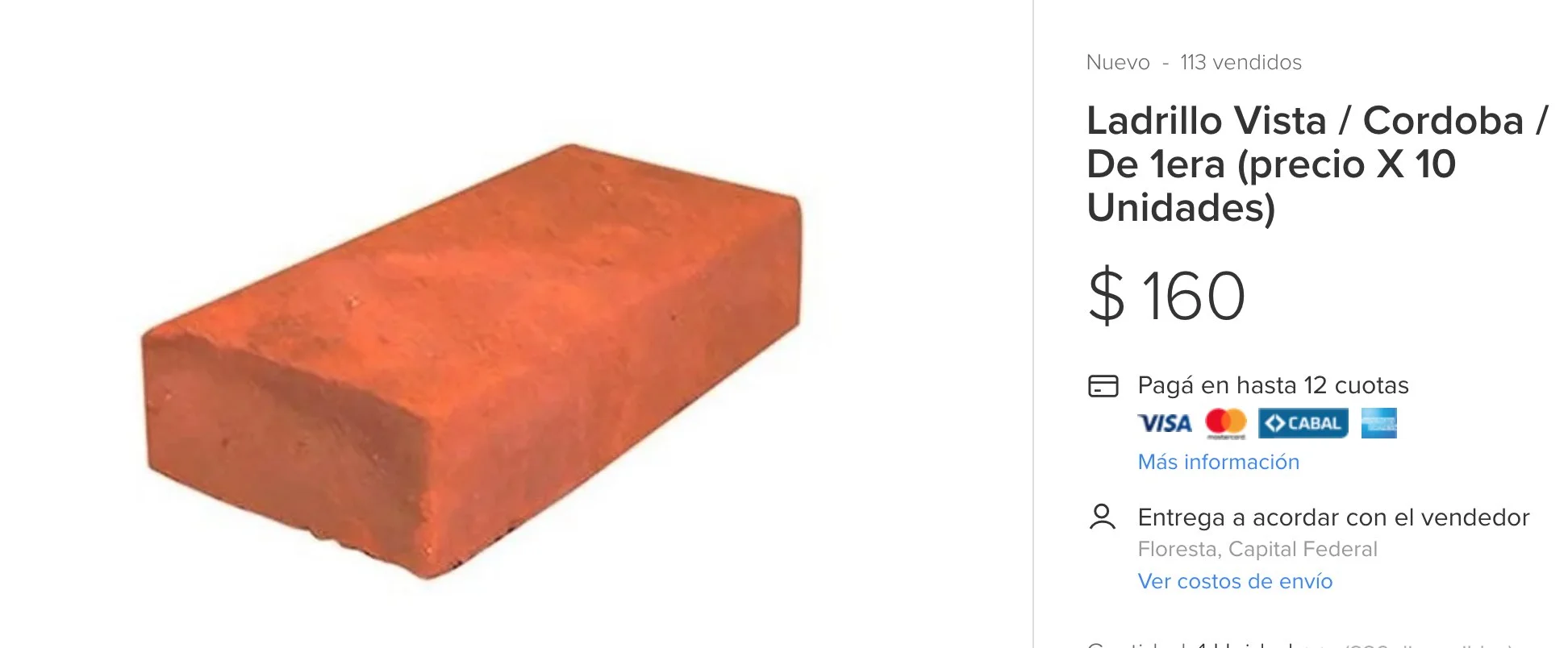 El precio de ladrillo visto en corralones, Easy y Mercadolibre ronda los 16 pesos por unidad a marzo de 2020.